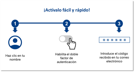 Activar el doble factor de autenticación es sencillo y directo. Tan solo se debe acceder al perfil de persona usuaria de la Zona Privada Empresa o Zona Privada Asesoría, habilitar la medida de seguridad e introducir el código recibido por correo electrónico.