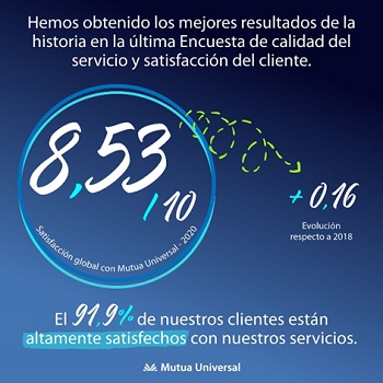 Mutua Universal, mutua colaboradora con la Seguridad Social, ha obtenido una satisfacción global de 8,53 puntos sobre 10 en la Encuesta de Calidad de Servicio correspondiente al año 2020. Este resultado supone un incremento de 0,16 puntos con relación a la edición anterior de la encuesta (realizada en 2018) y la valoración más alta que obtiene la Entidad en la serie histórica.