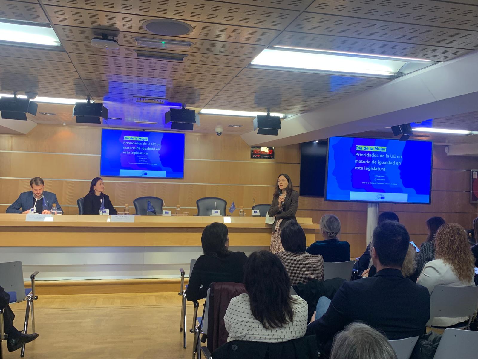 La jornada ha contado con la presencia de María Andrés, directora de la Oficina del Parlamento Europeo en España y las eurodiputadas Lina Gálvez, presidenta de la comisión de Derechos de las Mujeres e Igualdad de Género del Parlamento Europeo (S&D) y Rosa Estarás, vicepresidenta de la misma comisión parlamentaria (PPE)