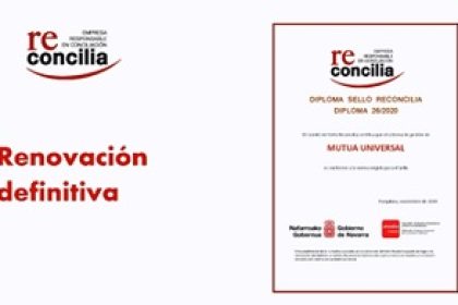 Mutua Universal, mutua colaboradora con la Seguridad Social, ha conseguido en el último trimestre de 2020 la renovación definitiva del sello “Reconcilia”, otorgado por el Gobierno de Navarra y de carácter bianual. La Entidad obtuvo por primera vez este reconocimiento en 2016, lo renovó en 2018 y en noviembre de 2020 ha conseguido la renovación con carácter definitivo.