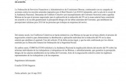 La Federación de Servicios Financieros y Administrativos de Comisiones Obreras, continuando con su campaña de acciones contra los recortes salariales impuestos por el Real Decreto Ley 8/2010 interpodrá, ante la sala de lo social de la Audiencia Nacional, Demandas de Conflicto Colectivo por incumplimiento del Convenio Sectorial contra aquellas Mutuas en las que el proceso negociador para la aplicación de la reducción del 5% en la masa salarial haya concluido sin acuerdo y no se esté garantizando la percepción íntegra de las tablas salariales del Convenio, que establecen las percepciones mínimas para 2010 de las personas que trabajan en empresas del sector.