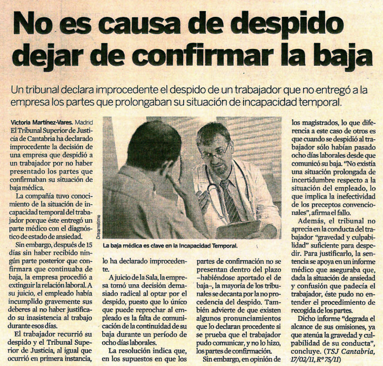 Un tribunal declara improcedente el despido de un trabajador que no entrego a la empresa los partes que prolongaban su situacion de incapacidad temporal.