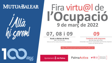 El evento, organizado por PalmaActiva, tendrá lugar entre el 7 y el 9 de marzo. La edición de este año será la primera que se celebre íntegramente en formato virtual. Mutua Balear vuelve a participar en la Fira de l’Ocupació que organiza anualmente PalmaActiva, la agencia de colocación del Ayuntamiento de Palma. La