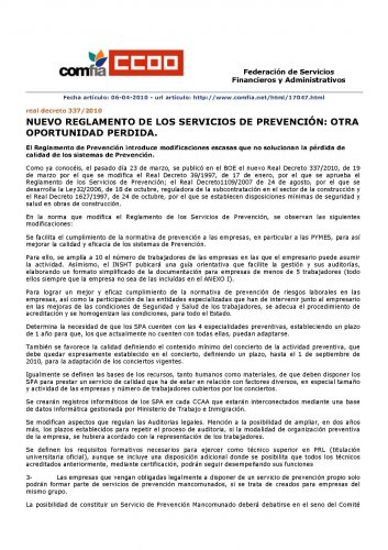 Desde Comfia CCOO, aunque valoramos positivamente los cambios introducidos por este Real Decreto que, sin duda, aportan elementos tendentes a incrementar la calidad de la prevencion, consideramos que se ha vuelto a perder una oportunidad extraordinaria para establecer los ratios maximos de empresas y trabajadores por tecnico o UBS, evitando asi la permanente sobrecarga de trabajo que sufrimos los trabajadores de los servicios de prevencion, causa fundamental de la perdida de calidad y de la exigencia de responsabilidades profesionales.