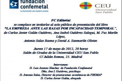 El próximo jueves 17 de mayo de 2012 se presenta en la Universidad CEU San Pablo en Madrid el libro La empresa ante las bajas por incapacidad temporal, una obra colectiva publicada por FC Editorial, que aborda esta materia desde un enfoque práctico y multidisciplinar. El trabajo ha sido coordinado por el abogado Carlos Javier Galán y junto a él son coautores la psicóloga Ana Isabel Gutiérrez, la abogada y profesora M. Paz Martín, el director de prestaciones económicas de FREMAP, Antonio Salas, y el detective privado David Sanmartín. El acto público de presentación dará comienzo a las 20 horas, en el Salón de Grados de la Universidad, calle Julián Romea núm. 23.