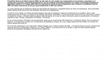 El Instituto Navarro de Salud Laboral (INSL) ha sido sede de una reunión con responsables en prevención y seguridad en el trabajo para presentar el portal Prevencion10.es, una herramienta informática diseñada para aplicar la Estrategia Española de Seguridad y Salud en el Trabajo 2007-2012 en empresas de menos de diez trabajadores, que en Navarra constituyen más del 50% del tejido empresarial, de las que aproximadamente el 30% son oficinas.