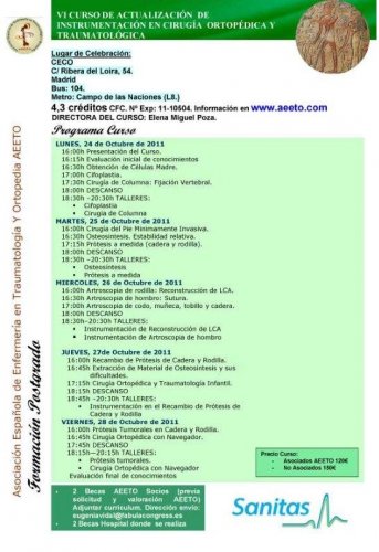 Este curso, dirigido al sector de enfermería y específico de Traumatología, ha sido organizado por la Asociación Española de Enfermería en Traumatología y Ortopedia (AEETO). Cada año se realizan dos cursos: uno básico y otro avanzado, teniendo carácter anual y siendo impartido a nivel nacional. Su primera edición fue en 2006 y desde el año siguiente participa en él nuestra Supervisora de Quirófano, Margarita Moreno.