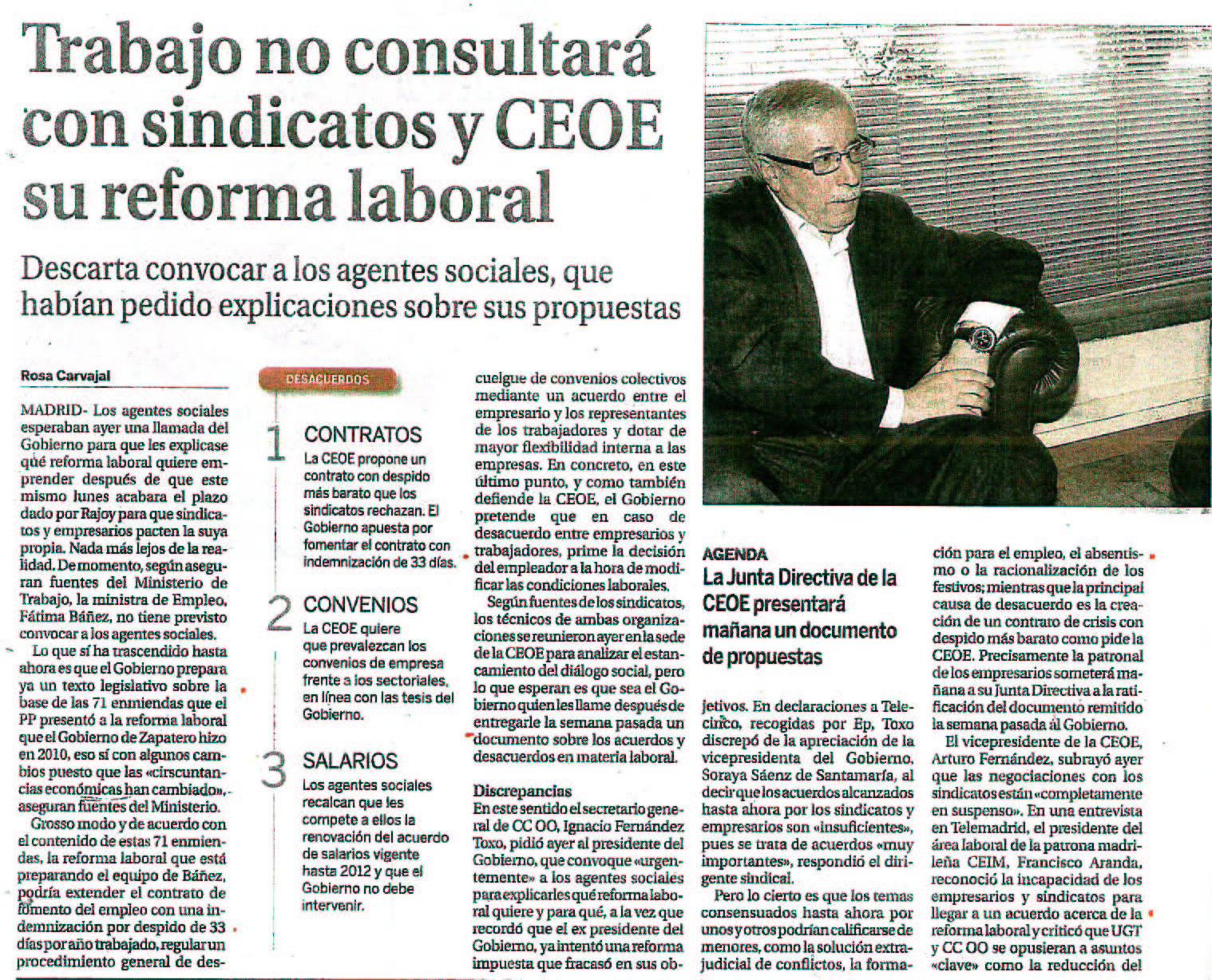 Trabajo no consultara con sindicatos y CEOE su reforma laboral.