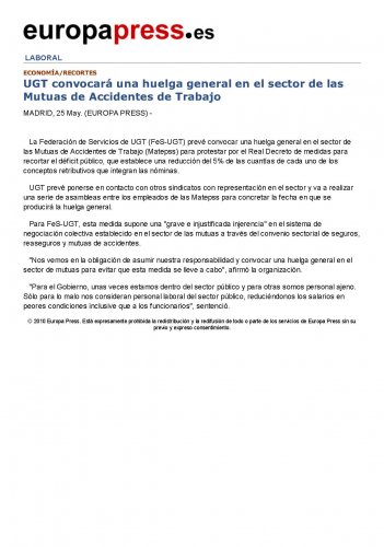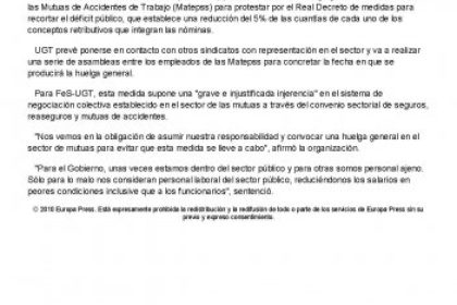 UGT prevé ponerse en contacto con otros sindicatos con representación en el sector y va a realizar una serie de asambleas entre los empleados de las Matepss para concretar la fecha en que se producirá la huelga general.