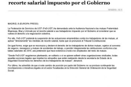 La Federación de Servicios de UGT (FeS-UGT) ha demandado ante la Audiencia Nacional a las mutuas Fraternidad-Muprespa, Maz y Umivale por el recorte salarial a sus trabajadores impuesto por el Gobierno al considerar que se vulnera el derecho a la negociación colectiva.