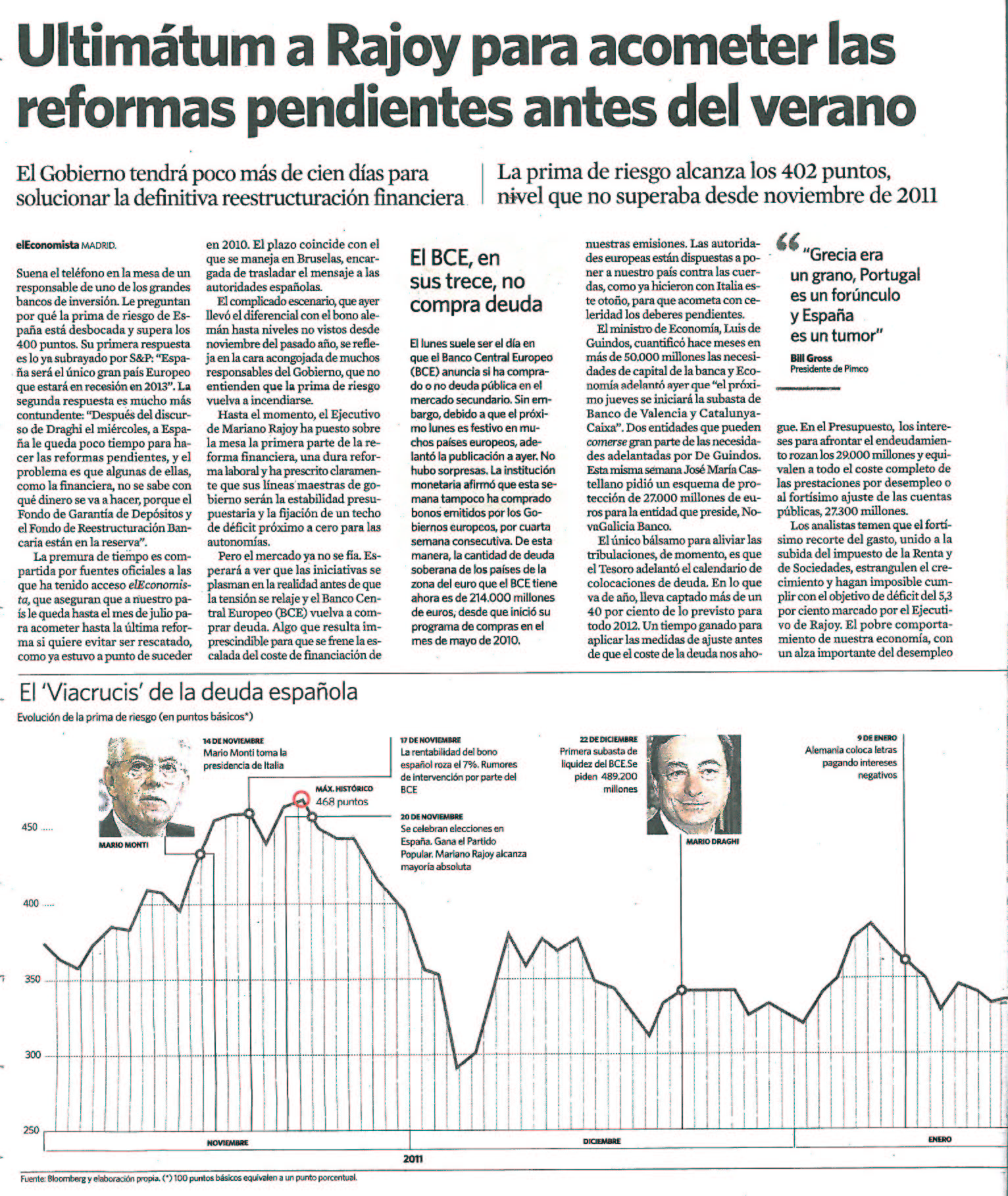 El Gobierno tendra poco mas de cien dias para solucionar la definitiva reestructuracion financiera. La prima de riesgo alcanza los 402 puntos, nivel que no superaba desde noviembre de 2011.