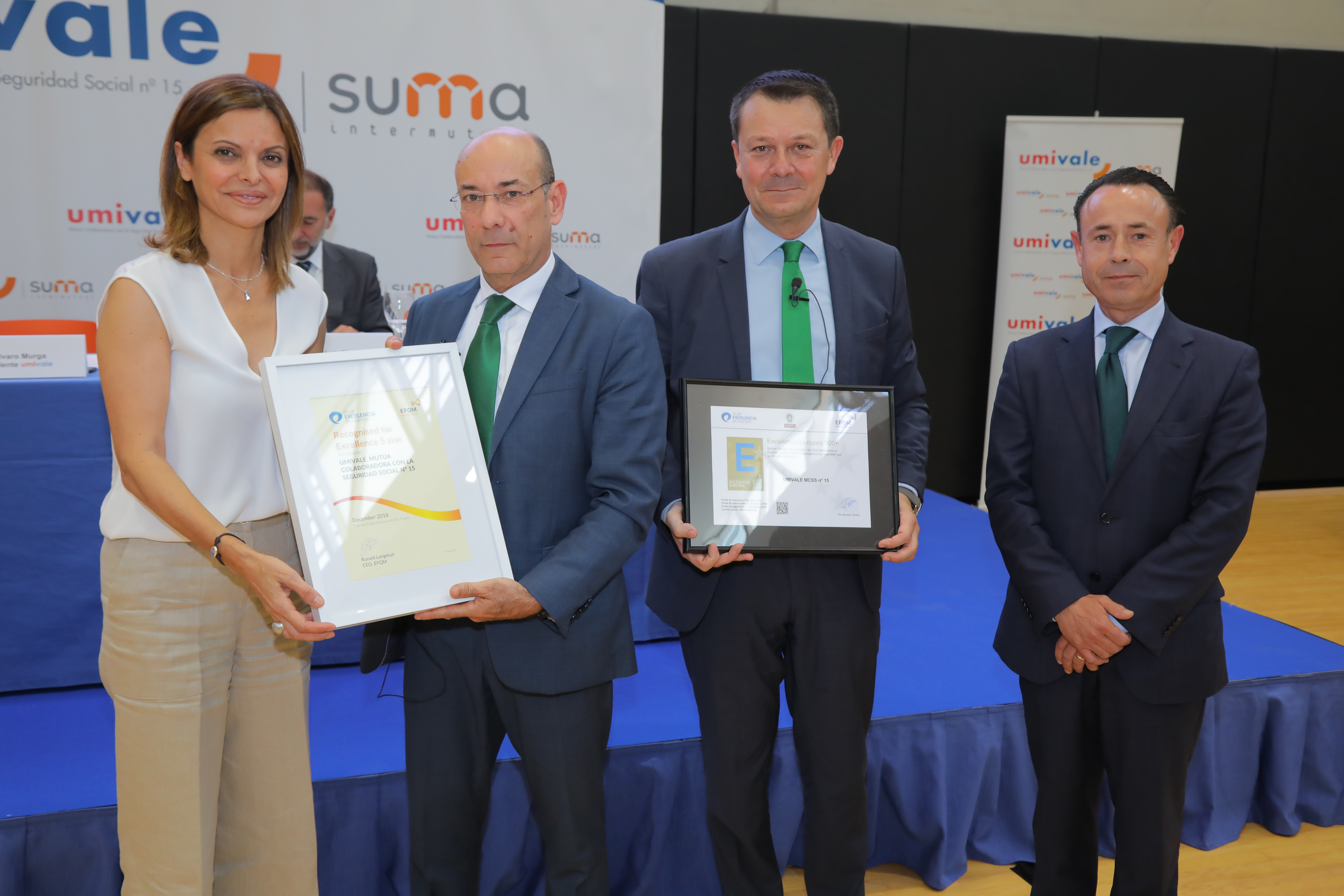 El presidente de umivale, Alvaro Murga, y el director gerente, Hector Blasco, han recibido el distintivo de manos de Mercedes Hernandez, Directora de Socios del Club Excelencia en Gestion, y de Patricio Calatayud, director regional de Bureau Veritas, entidad certificadora acreditada por el CEG.