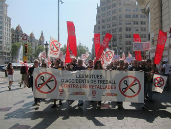 Tras una pancarta en la que se podia leer ‘Las mutuas de accidentes de trabajo contra los recortes’ y bajo vitores como ‘Esto no es una crisis, es una estafa’, los trabajadores han partido de la calle Balmes y han recorrido Gran Via hasta llegar a la calle Aragon, frente a las oficinas de la tesoreria de la Seguridad Social.