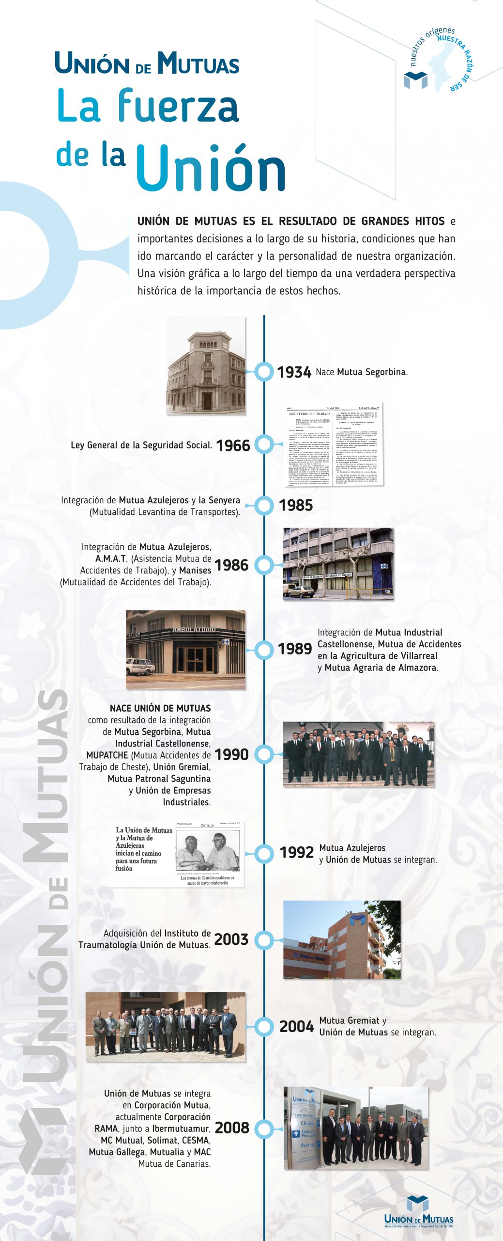 La conexión histórica entre Unión de Mutuas y Segorbe es indisoluble. La capital del Alto Palancia fue testigo en 1934 del nacimiento de Mutua Segorbina, entidad que se fue fusionando con otras mutuas para finalmente dar origen a Unión de Mutuas en 1990. Desde entonces, Unión de Mutuas ha crecido hasta convertirse en un pilar fundamental para el tejido social y empresarial de la comarca, siendo el centro de referencia para todos los municipios del Alto Palancia a nivel asistencial.