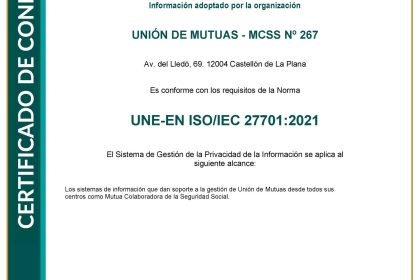 La norma ISO 27701:2021 se constituye como una extensión de la ISO 27001, que proporciona un modelo para la implementación, revisión, mantenimiento y mejora de un Sistema de Gestión de la Privacidad de la Información y cuya certificación ha sido viable por contar ya en Unión de Mutuas con la certificación de la ISO 27001.