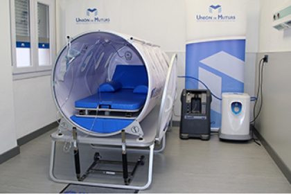 Unión de Mutuas acaba de poner en marcha, en su centro hospitalario de Castellón, la Unidad de Medicina Hiperbárica, una terapia no invasiva, sin efectos secundarios, por el que los pacientes, ubicados en una cámara presurizada, reciben oxígeno en una concentración cercana al 100% a una presión de 1’40 atmósferas.