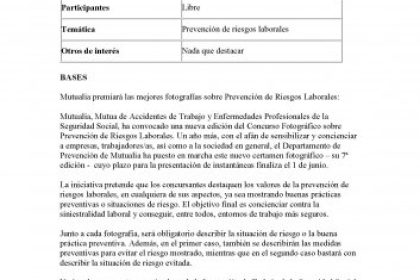 Mutualia, Mutua de Accidentes de Trabajo y Enfermedades Profesionales de la Seguridad Social, ha convocado una nueva edición del Concurso Fotográfico sobre Prevención de Riesgos Laborales. Un año más, con el afán de sensibilizar y concienciar a empresas, trabajadores/as, así como a la sociedad en general, el Departamento de Prevención de Mutualia ha puesto en marcha este nuevo certamen fotográfico – su 7ª edición – cuyo plazo para la presentación de instantáneas finaliza el 1 de junio.